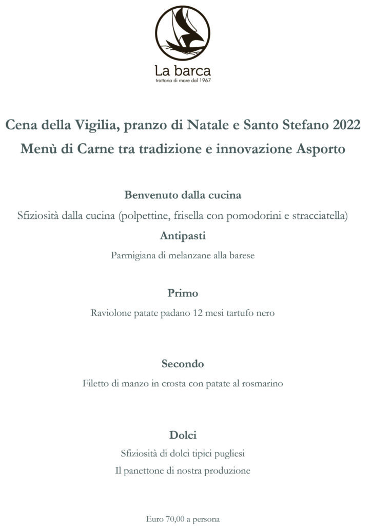 Novembre 17, 2022 Eventi a tema Menù d’Asporto per le festività natalizie! Direttamente a casa tua tutte le prelibatezze del nostro ristorante! Scegli quale menù mettere in tavola! Vi aspettiamo! 0 Comments
